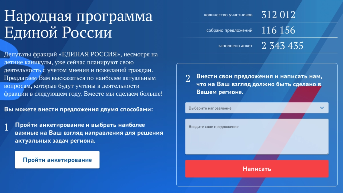 «Единая Россия» подвела промежуточные итоги работы партийного сайта народной программы: за неделю на портал поступило более ста тысяч предложений от жителей регионов страны, всего пользователи заполнили более двух миллионов анкет с конкретными предложениями.