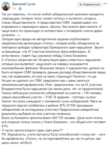 «Предположим, что на 47 участках Владивостока были нарушения. На самом деле -нет, но предположим. Самое небольшое количество избирателей на участке — 130 человек, самый масштабный участок — 3145. В среднем — полторы тысячи. Значит это всего 70500 избирателей. Явка в городских округах составила 30%. Значит, на выборы во Владивостоке пришли 21150 избирателей. Допустим, результаты на этих 47 участках отменяют. Но за избранного губернатора Олега Кожемяко проголосовало 420730 челок. Если отнять все спорные голоса только у Олега Кожемяко, то все равно его результат составит 61%. Так что ни о каком кардинальном пересмотре итогов выборов не может быть и речи», — заключил Гусев.