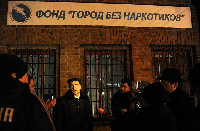 Представитель следственного управления СКР в Свердловской области Максим Чалков (в центре) общается с журналистами у здания некоммерческого фонда "Город без наркотиков" в Екатеринбурге. © Павел Лисицын/РИА Новости