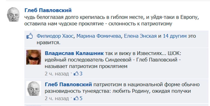 Провокационные высказывания, ранящие до крови сердца добропорядочных граждан России политолог, ранее считавшийся одним из «рупоров» власти, а потом ушедший в «махровую оппозицию», допустил на своей страничке Facebook.