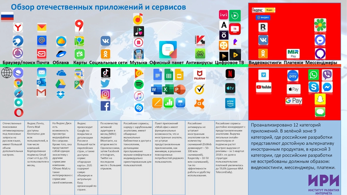 «Мы провели определенные исследования, которые подтвердили, что в России сформировался целый пул конкурентоспособных приложений. Уже сейчас их можно рекомендовать в качестве обязательных для установки на цифровые устройства, продающиеся на территории нашей страны. Тем более, многие наши приложения — это сервисы, которые популярнее западных аналогов», — рассказал «Ридусу» руководитель ИРИ Сергей Петров.