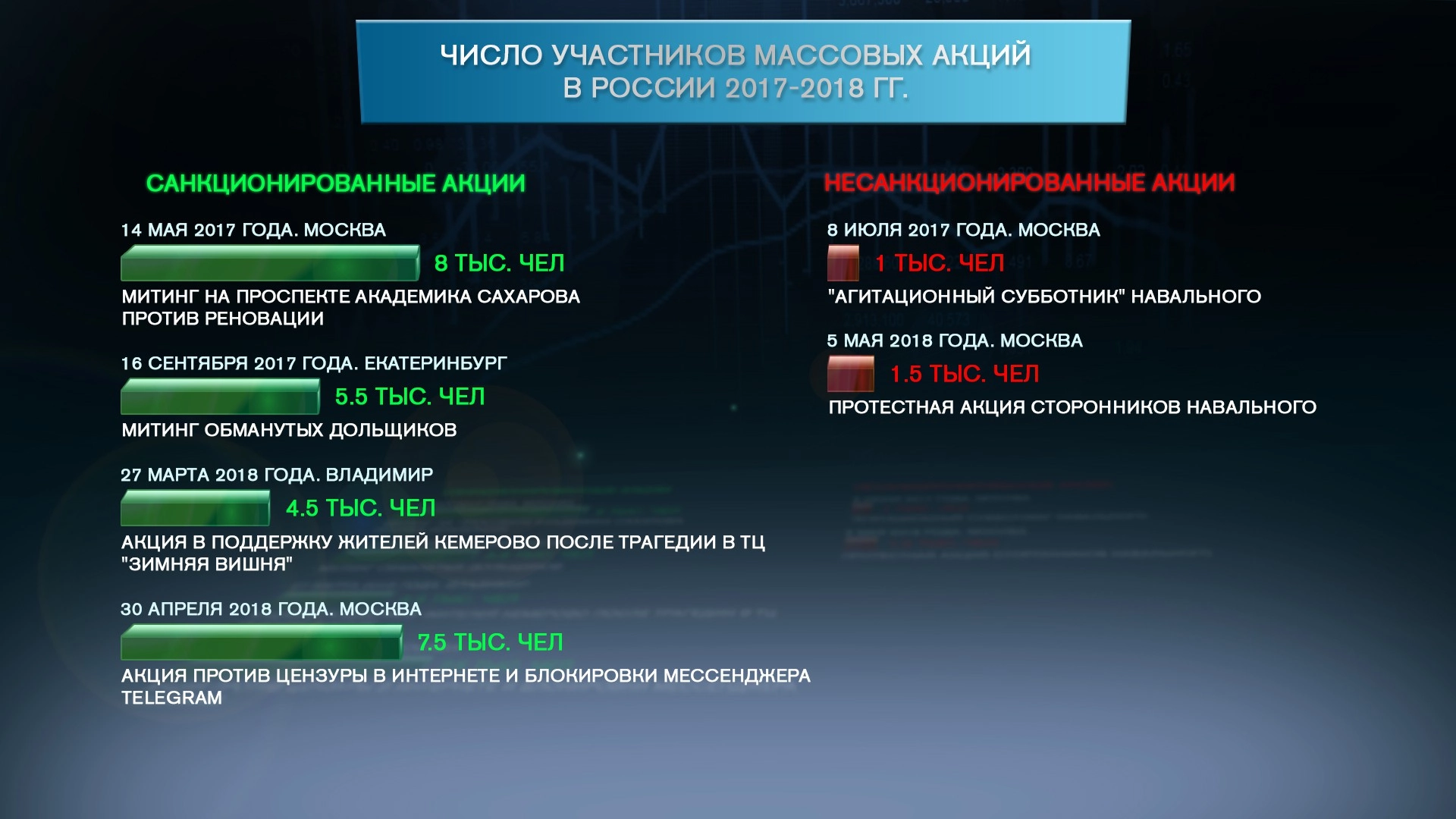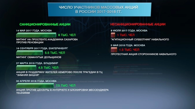 «А есть акции, которые действительно носили массовый характер и при этом были согласованы властями (как бы Навальный ни пытался представить, что у нас не разрешают их проводить). Они как раз были про то, что людей волнует», — цитируют Мартынова «Известия». В качестве примера эксперт приводит акцию против блокировки мессенджера Telegram, которую организовала «Либертарианская партия России»: 30 апреля ей удалось собрать на проспекте Сахарова порядка семи с половиной тысяч человек.