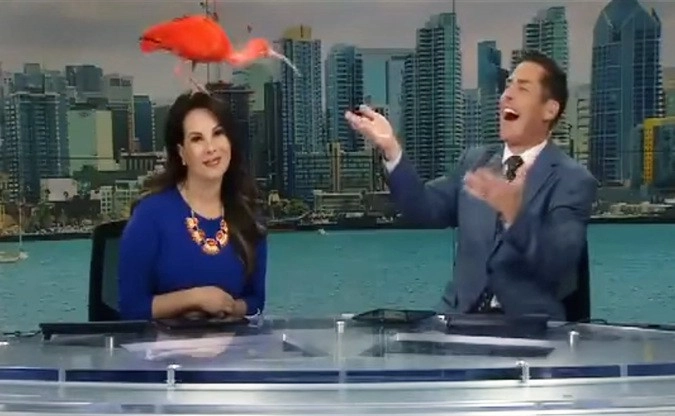 Забавный случай произошел в прямом эфире новостной программы американского телеканала CBS. В кадр неожиданно залетела экзотическая птица и села на голову телеведущей Нишель Медине.