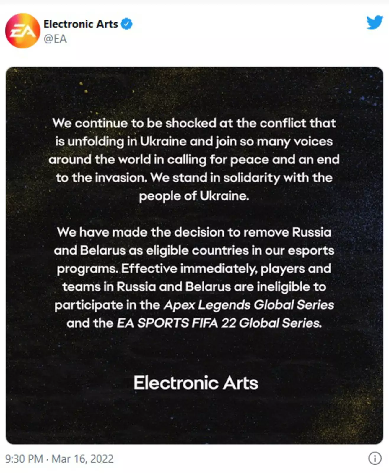 «Мы по-прежнему потрясены конфликтом, который разворачивается на Украине, и присоединяемся к голосам, призывающим к миру. Мы приняли решение исключить Россию и Белоруссию из числа стран, имеющих право участвовать в наших киберспортивных программах. С этого момента игроки и команды из России и Белоруссии не имеют права участвовать в Apex Legends Global Series и EA Sports FIFA 22 Global Series», — написали представители EA.