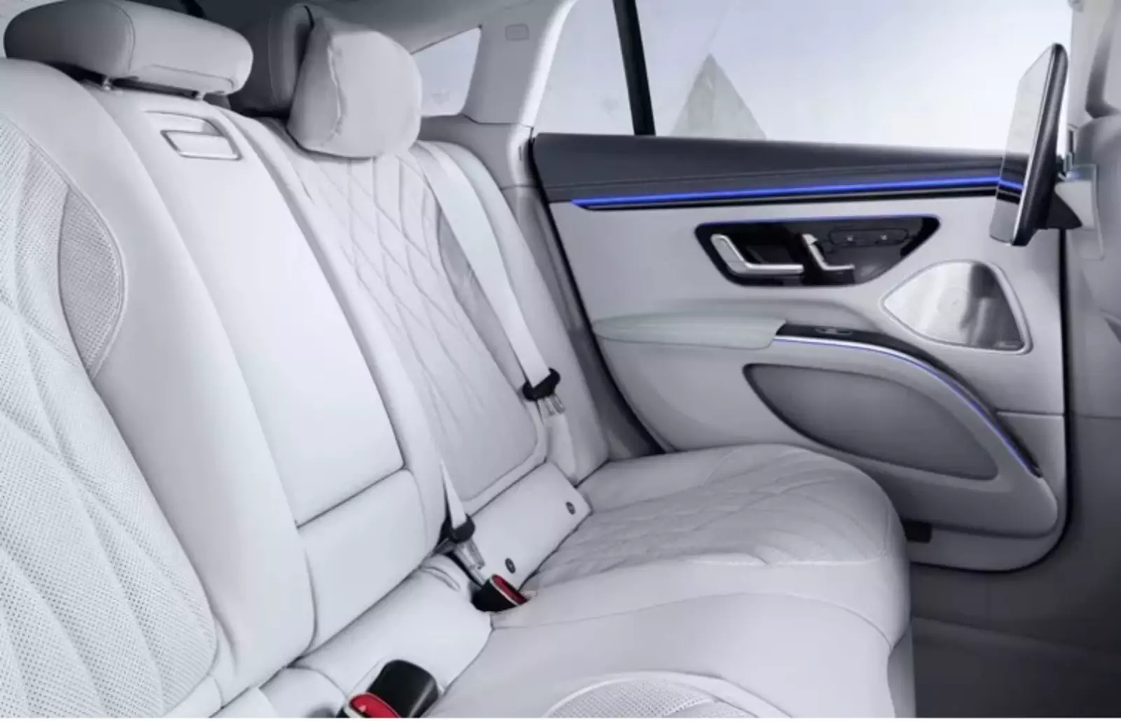 Главное украшение салона EQE — огромный блок из трех дисплеев под общим стеклом. Перед глазами водителя расположена виртуальная приборная панель на экране с диагональю 12,3 дюйма. Такой же экран с функцией тачскрина находится на панели напротив переднего пассажира. В центре расположен экран информационно-развлекательной системы с диагональю 17,7 дюйма.