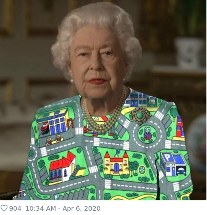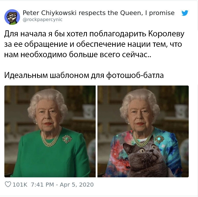 Питер Чийковский в своем Twitter назвал наряд королевы идеальным шаблоном для фотошоп-батла и запустил целую волну фотомонтажей.