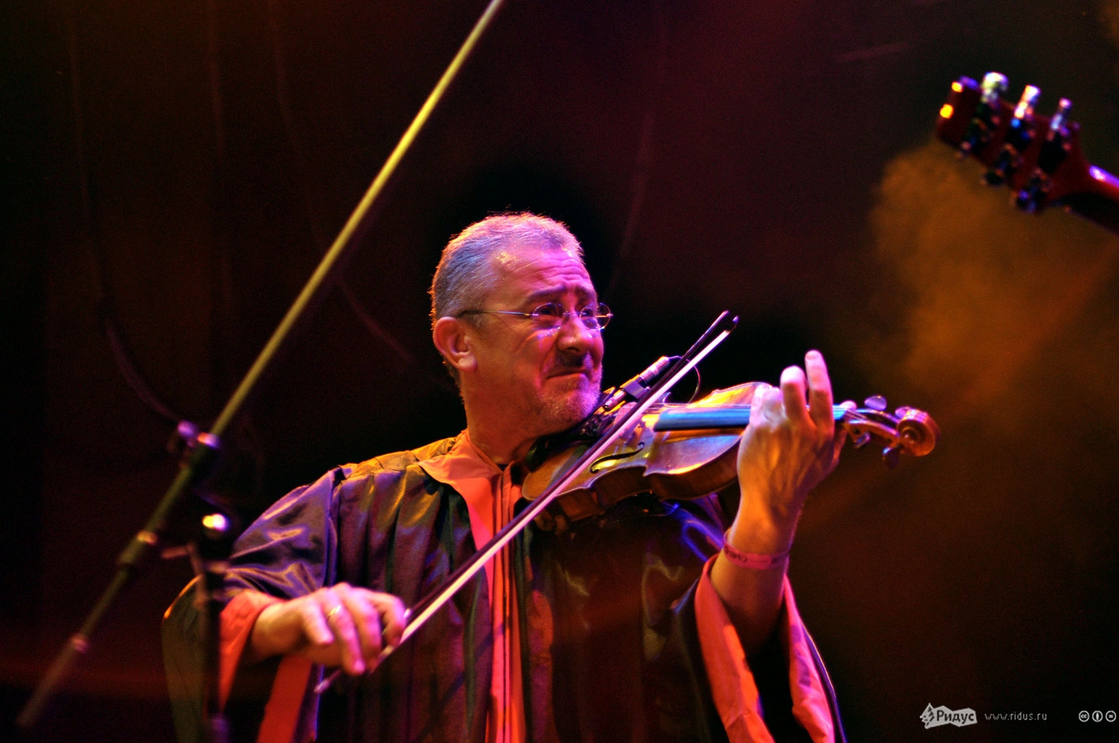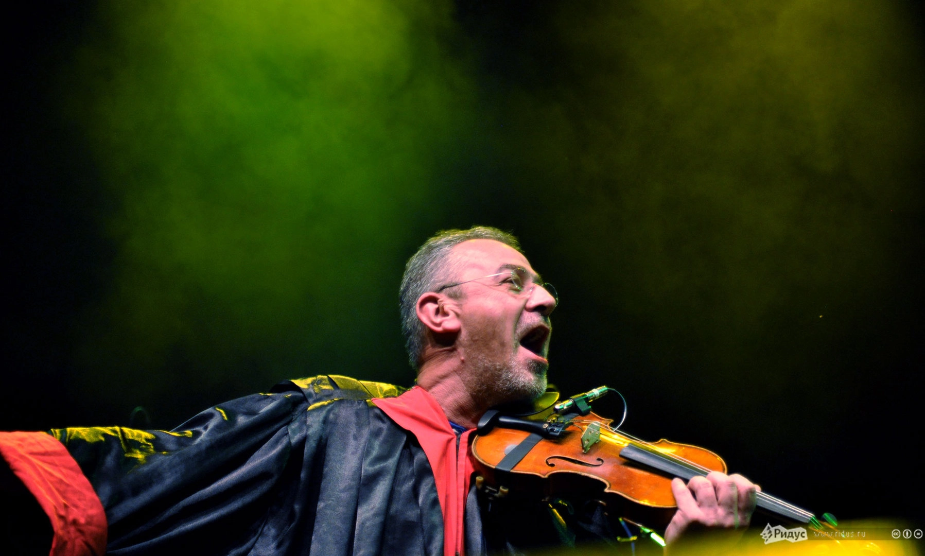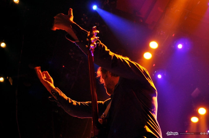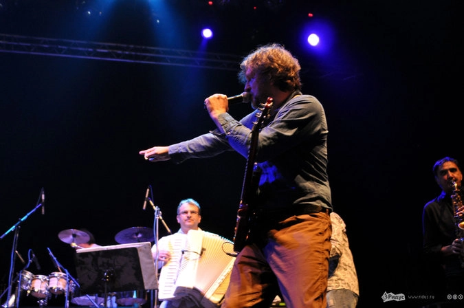 А герои вечера появились на сцене, сияя озорными улыбками, обмениваясь шутками и приветствуя публику на русском языке. Складывалось ощущение, что музыканты не только что вышли на подмостки, а отходили на перекур с оживленного карнавала. Зал в считанные секунды пропитался атмосферой бесшабашного праздника под балканские напевы The No Smoking Orchestra. Музыканты (те, которым позволял инструмент) туда-сюда перемещались по сцене, успевая похохотать то с одним участником коллектива, то с другим, то подмигнуть симпатичной барышне в зале, то жестами призвать в пляс публику. Колоритнее всех смотрелся Деян Спаравало в своей красно-черной мантии и со скрипкой, смычком от которой он то и дело дирижировал залу.