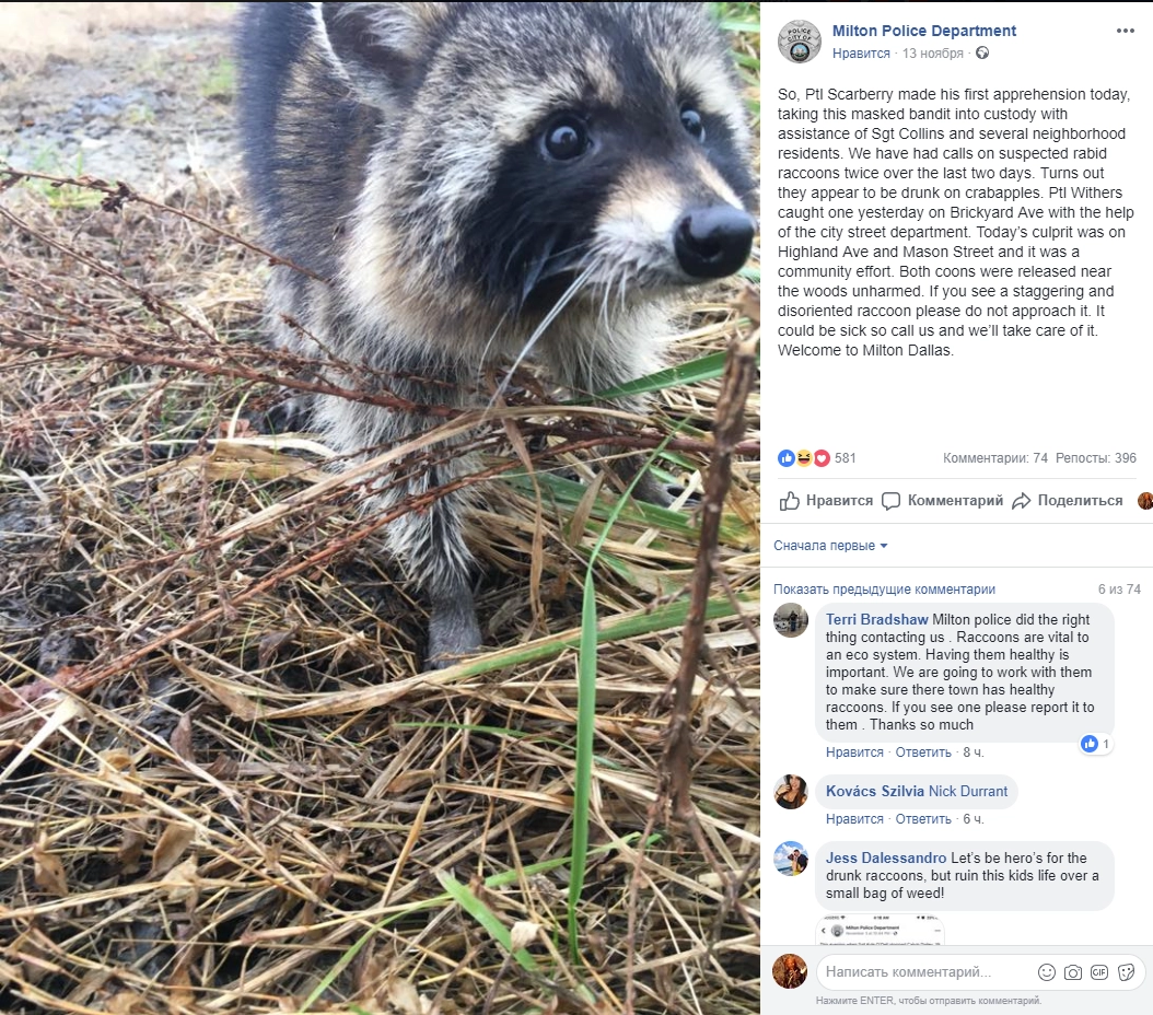 В американском городе Милтон, штат Западная Вирджиния, местные жители обеспокоились странным поведением двух енотов и сообщили об этом в полицию. По их словам, животные подозрительно шатались, а один из них и вовсе упал при попытке перелезть через ограду. Енотов заподозрили в бешенстве.