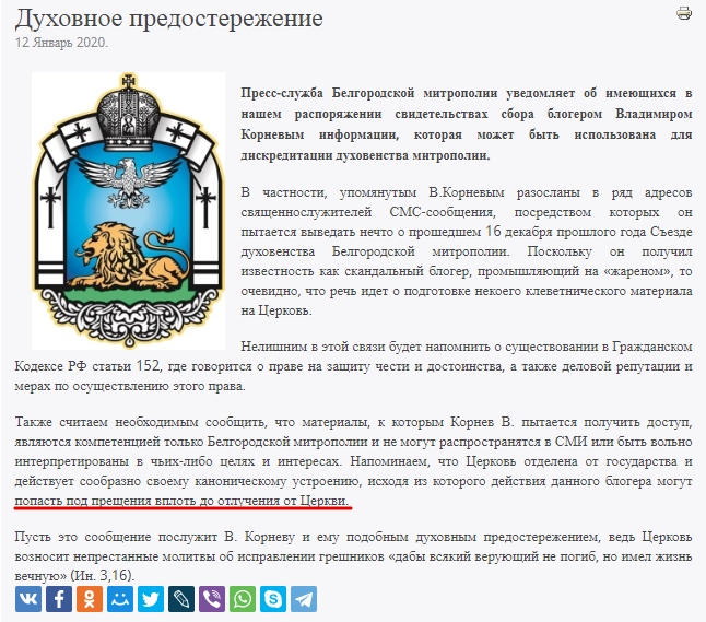 Белгородская епархия Русской православной церкви опубликовала на официальном сайте «духовное предупреждение» местному блогеру Владимиру Корневу, автору Telegram-канала «Белгород № 1».