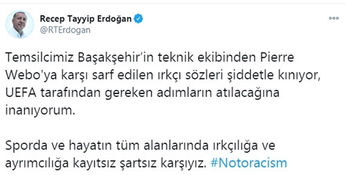 Турецкий лидер подчеркнул, что он «решительно осуждает расистские высказывания в адрес Пьера Вебо» и «надеется, что UEFA предпримет необходимые шаги».