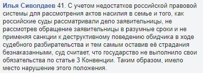 Как утверждает Сиволдаев, суды в РФ не рассмотрели обращение заявительницы в разумные сроки и не применили санкции к деструктивному поведению обидчика в ходе судебного разбирательства, тем самым оставив ее страдания безнаказанными.