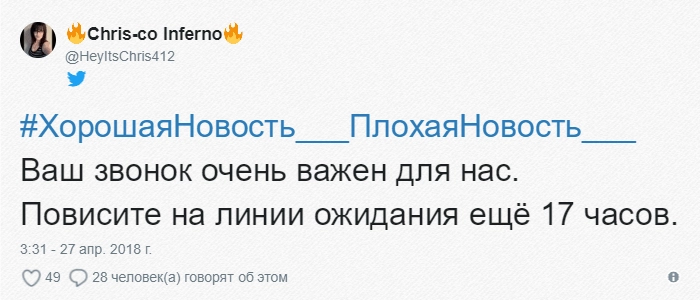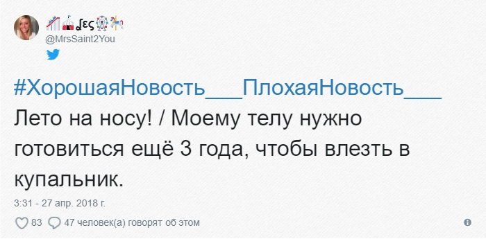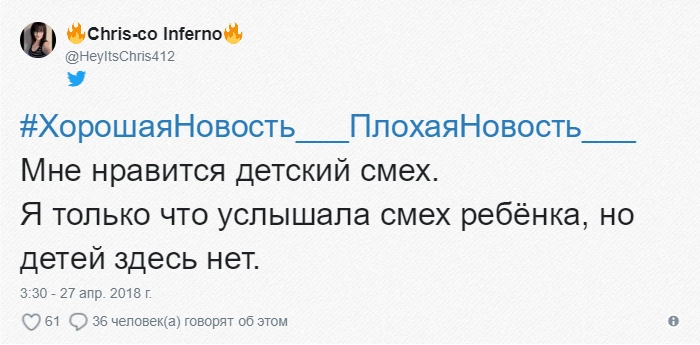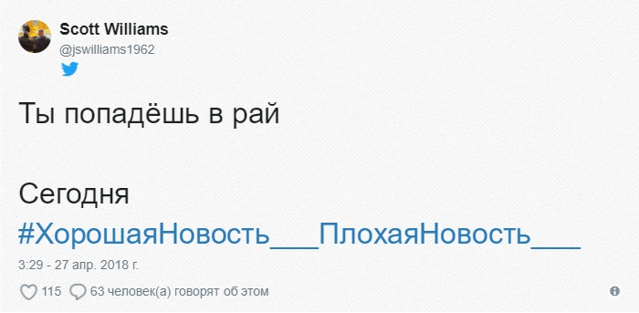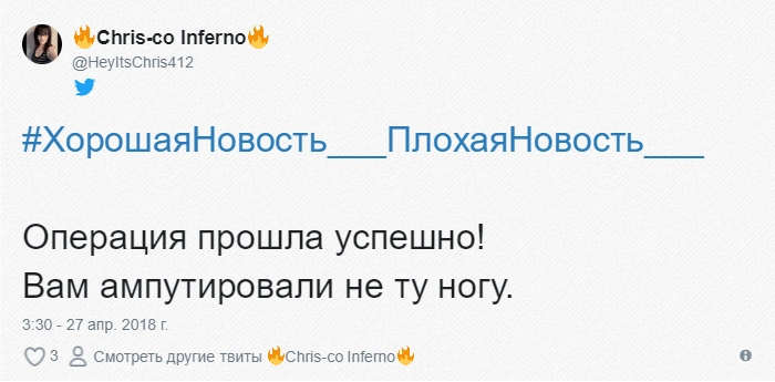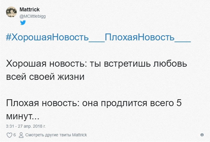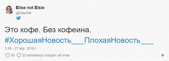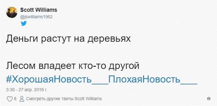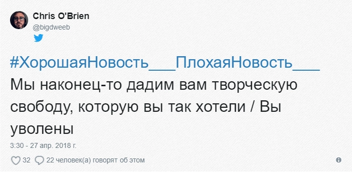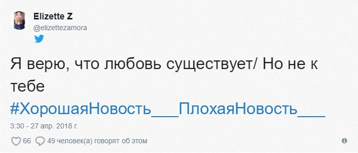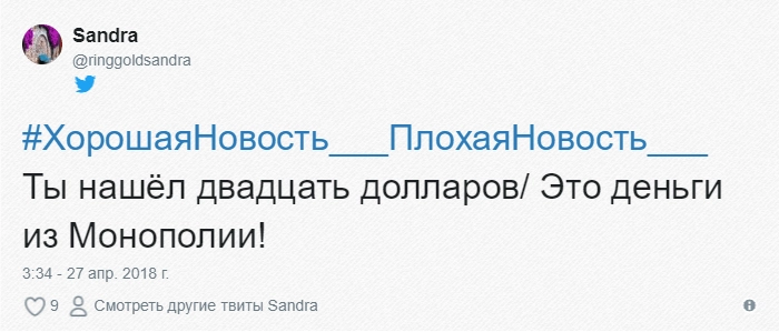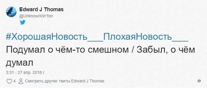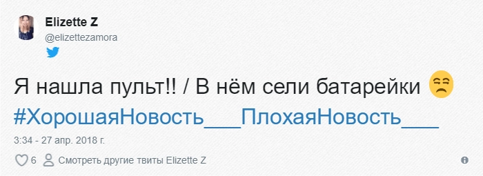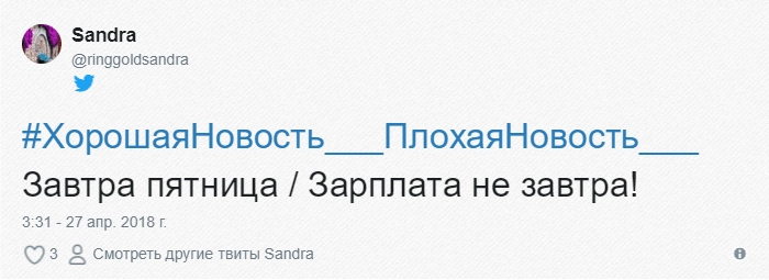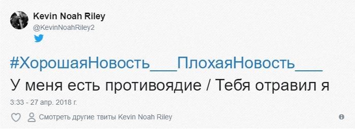 Наверняка вы частенько слышали фразу: «У меня есть две новости: хорошая и плохая. С какой начать?» Выбираете сначала услышать хорошую? Может, зря, потому что иногда плохая новость полностью перечёркивает хорошую. Эту тему решили развить пользователи Twitter и посоревновались в юморе, отметив свои посты хештегами #TheGoodNewsIs___TheBadNewsIs___. Получилось и смешно, и грустно.