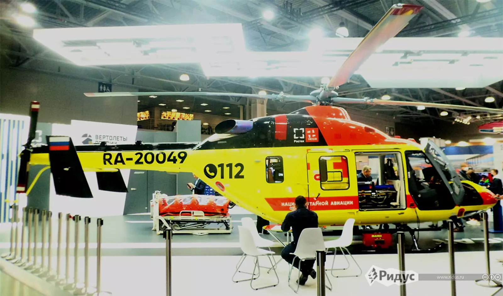 Холдинг «Вертолёты России» представил санитарную модификацию вертолета «Ансат» с медицинским модулем, а также беспилотное авиационное воздушное судно — БАС-200.