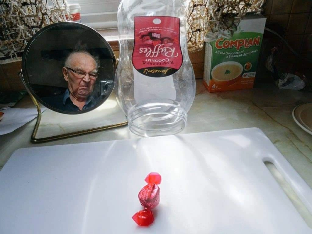 «Месяц назад купил дедушке банку его любимых конфет. Сегодня он прислал мне это фото на почту. Судя по всему, пора покупать новую»