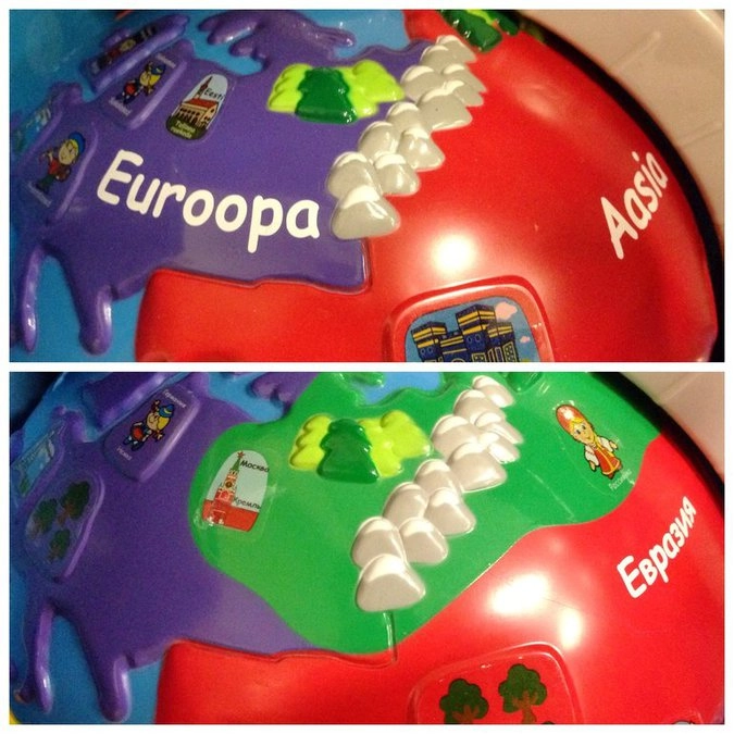 При этом на моделях того же глобуса для русскоязычных детей авторы обозначили Москву и Кремль. Зато вместо некоторых европейских народов в русской версии растут леса или вовсе ничего нет.