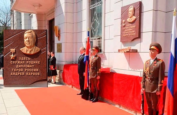 Кстати. На прошлой неделе в посольстве России в Пхеньяне прошла торжественная церемония по случаю открытия мемориальной доски с барельефом Андрея Карлова. Он работал здесь с 1976 по 1990 гг. (с перерывом). Духовой оркестр Корейской народной армии исполнил гимны России и КНДР.