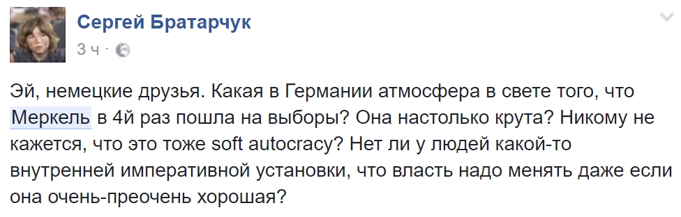 «Как и любой другой политик, Меркель настроена на то, чтобы оставаться у власти как можно дольше, — отметил в беседе с „Ридусом“ политический аналитик международной мониторинговой организации CIS-EMO Станислав Бышок. — Если немцы хотят видеть продолжение политики открытых дверей, приема экономических мигрантов, которых, почему-то, называют „беженцами“, если хотят продолжения совершенно ненужной германской экономике противостояния с России — вольному воля».