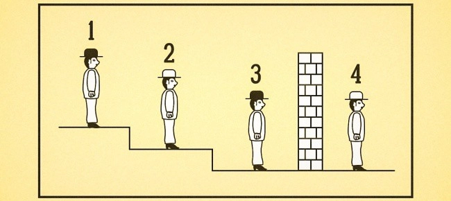 На заключённых надели две белые шляпы и две чёрные шляпы. Но ни один из них не знает, какого цвета шляпа у него на голове. Подсудимых выстроили друг за другом таким образом (смотрите рисунок), что: