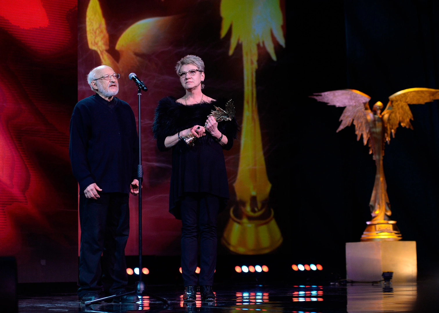 Сценарист, соратник и жена Алексея Германа-старшего Светлана Кармалита и режиссер Алексей Герман-младший получают приз в номинации "Лучшая режиссерская работа" за фильм Алексея Германа-старшего "Трудно быть Богом"