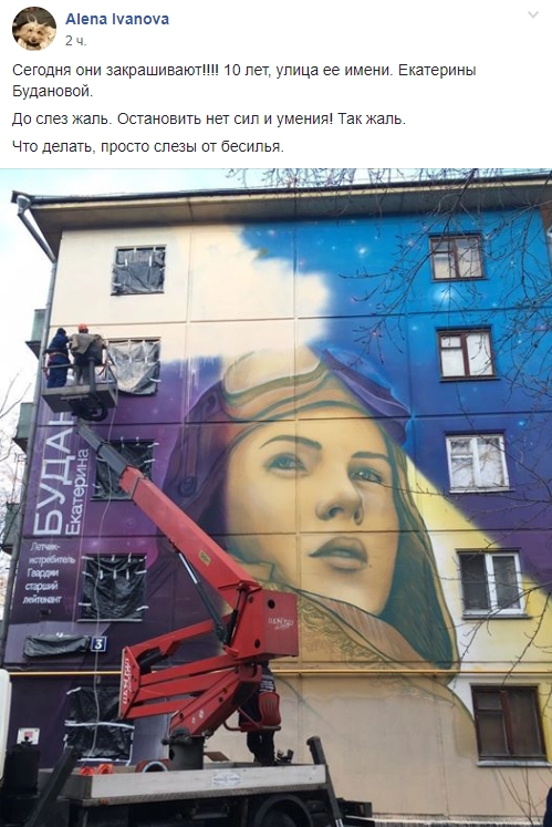 В Москве на улице, носящей имя советского летчика-истребителя времен Великой Отечественной войны, Героя России Екатерины Будановой, закрасили ее огромный портрет, изображенный на стене дома № 3. Об этом сообщают в социальных сетях жители столицы.