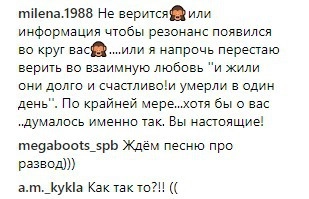 «Более огненной пары, чем вы, не сыскать. Это было красиво», «Это хуже развода Питта и Джоли», «Обалдеть, новость из серии шокирующих», «Зря», «Вы для всех были эталоном, очень жаль», «Если расставание может быть хорошим, то это оно. По-дружески, по-доброму», «Ну нет… Скажите, что это шутка, ну пожалуйста», — огорчились пользователи.