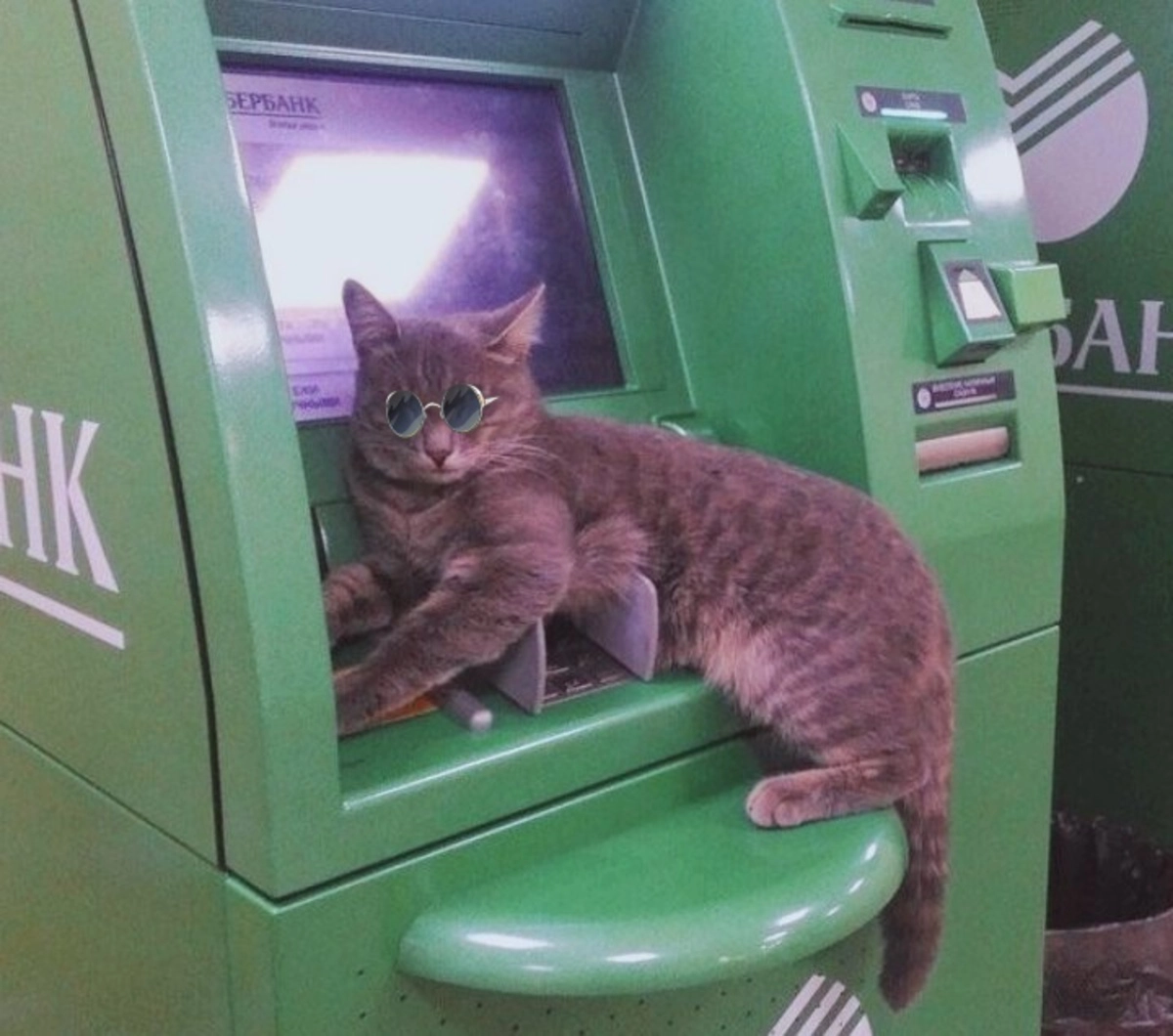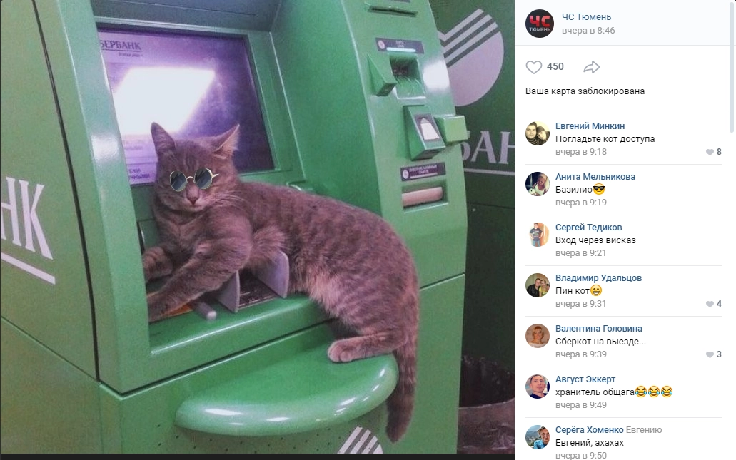 В социальной сети ВКонтакте в группе «ЧС Тюмень» опубликовали фотографию кота, который вальяжно лежит прямо на банкомате. И хоть усатый и заблокировал доступ к автомату, но вызвал не раздражение, а умиление. Посетители не решались потревожить животное, зато делали фото и придумывали шуточки.