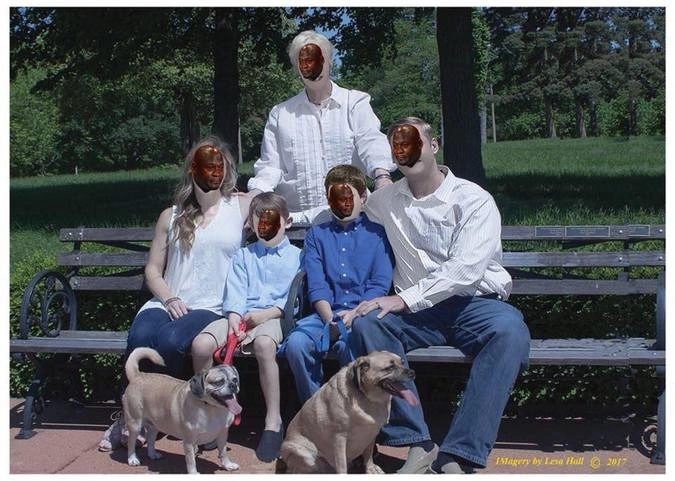 На фото присутствуют все члены семьи и две собаки. Однако лишь внешность животных не подверглась никаким изменениям. Лица людей не просто отретушированы, а будто нарисованы в специальной программе.
