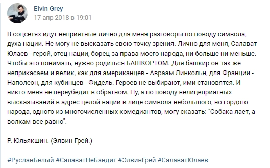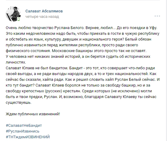 «Вчера в одной из телевизионных программ на канале ТНТ комик Руслан Белый назвал Салавата Юлаева бандитом. Меня как башкира оскорбили эти слова. Я считаю, он должен извиниться перед нами за сказанное. Для нас, башкир, Салават Юлаев был и остается национальным героем. И никакие заезжие гастролеры не поменяют наше мнение о нем», — подписал ролик спортсмен.
