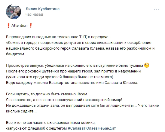 Мы считаем, что своим высказыванием ведущий телеканала ТНТ не только показал степень своей некомпетентности, низкий уровень культуры, но и оскорбил весь многонациональный народ Башкортостана. Более того, его провокационные высказывания направлены на дестабилизацию межнациональных отношений в республике и подрыв основ государственности России, сообщили в пресс-службе исполкома.