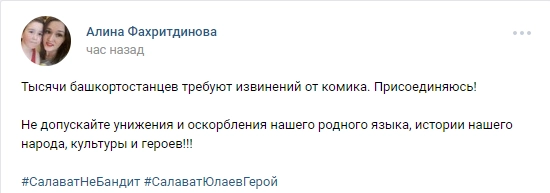 Кроме того, комик, возможно, неосознанно повторил тезисы блогеров сайта «Уфагубъ». Впоследствии их признали экстремистскими. Так называемые уфагубовцы как раз утверждали, что Юлаев — разбойник и бандит, добавил Бадранов.
