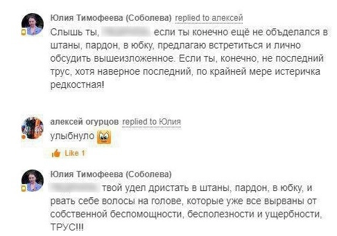Не всем подписчикам Тимофеевой это понравилось. Несколько пользователей обвинили ее в пиаре на популярной теме, среди критиков были и бывшие товарищи депутата по партии. Ивановский политик не полезла за словом в карман и ответила резко и нецензурно.