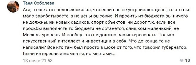 Можно жаловаться на жизнь, на отсутствие денег, но, надеюсь, вы вырастите в парадигме, что нужно больше зарабатывать. Если вы будете работать над собой, цена на бензин не будет вас волновать. Иначе придется долго рассказывать про продажу нефти за рубеж, акцизы… Я хочу, чтобы молодежь думала по-другому, к чему-то стремилась.
