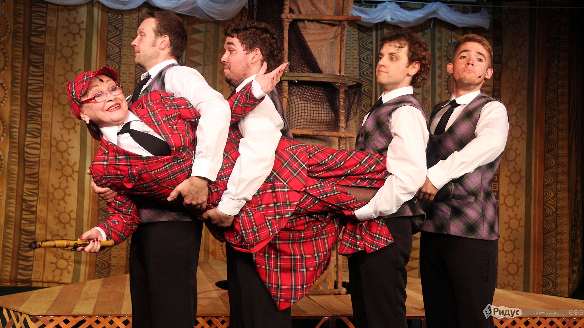 Зал, на удивление, маленький, если не крохотный: помещение может вместить, наверное, меньше сотни людей. Еще до начала представления можно рассмотреть декорации. Они выглядят скромно: небольшая сцена, в центре которой стоит какой-то столб, с потолка свисают «лианы» и канаты, по бокам находятся разрисованные лестницы, а стены завешаны тканью с «экзотическим» узором. Как выяснилось позже, такие декорации многофункциональны: столб на сцене служит и деревом Тарзану, и мачтой морского судна. А подвижная платформа превращается в палубу корабля, раскачиваемого волнами.