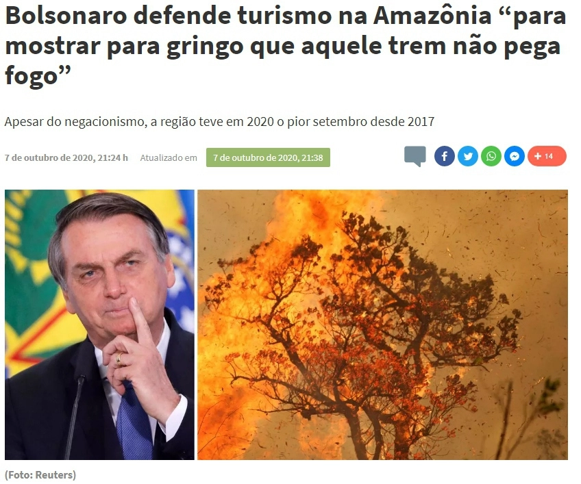 Дело в том, что на минувшей неделе президент Бразилии заявил о необходимости восстановить разрушенную туристическую отрасль Амазонии, лишившуюся иностранных туристов, которые перестали посещать этот регион страны из-за экологических проблем, непрекращающихся лесных пожаров и проблем с безопасностью (в том числе из-за угроз полицейских репрессий).