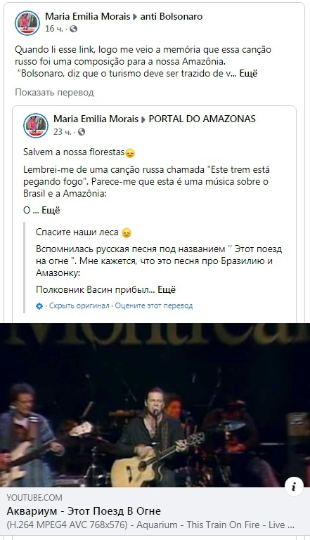 Неожиданную известность в бразильских соцсетях приобрела песня «Этот поезд в огне» в исполнении Бориса Гребенщикова и группы «Аквариум».