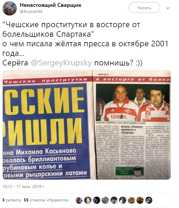 Спортсмен рассказал об этом в микроблоге фаната «Спартака» «Ненастоящий Сварщик», в котором нередко затрагивается тема былых похождений поклонников футбольного клуба.