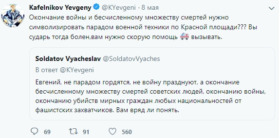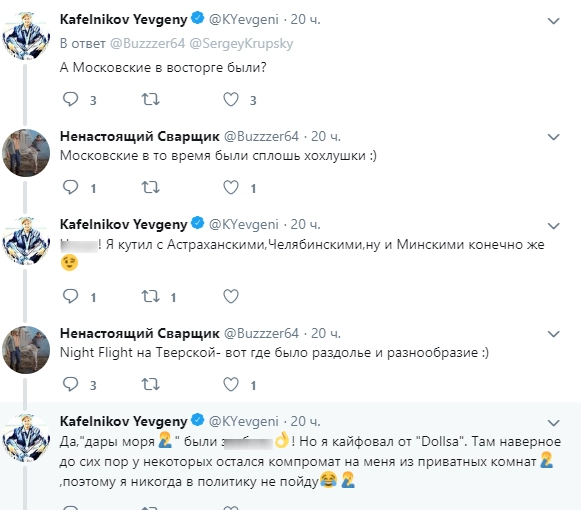Евгений Кафельников прославился в Twitter своей скандальной манерой ведения микроблога. Так, в 2018 году у теннисиста возник конфликт с журналистом Sport24 Максимом Алланазаровым. По словам корреспондента, в течение полугода Кафельников сначала просто оскорблял его, а потом стал обвинять в торговле наркотиками. Сам Алланазаров утверждает, что незнаком со знаменитым спортсменом.