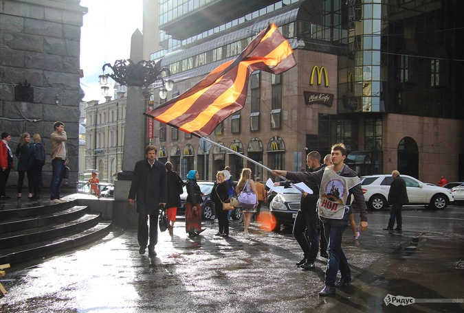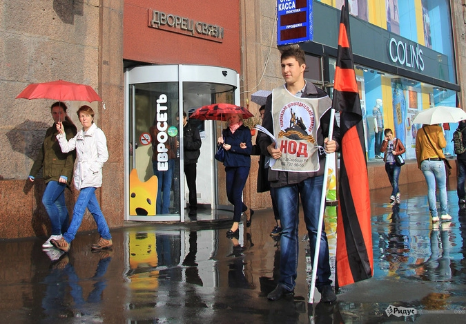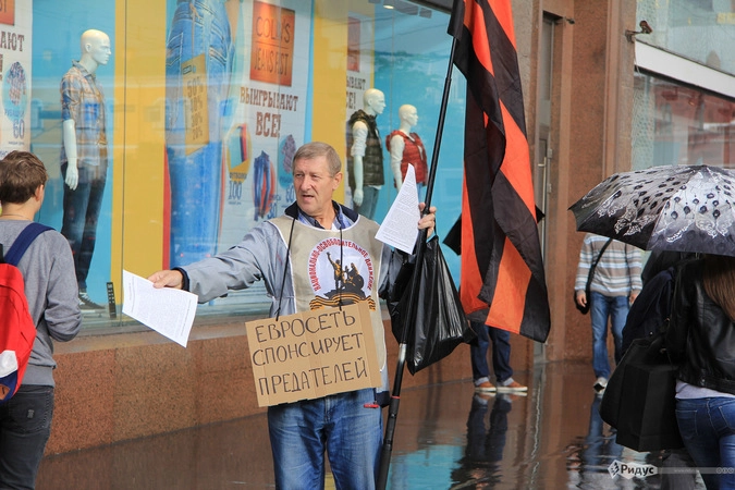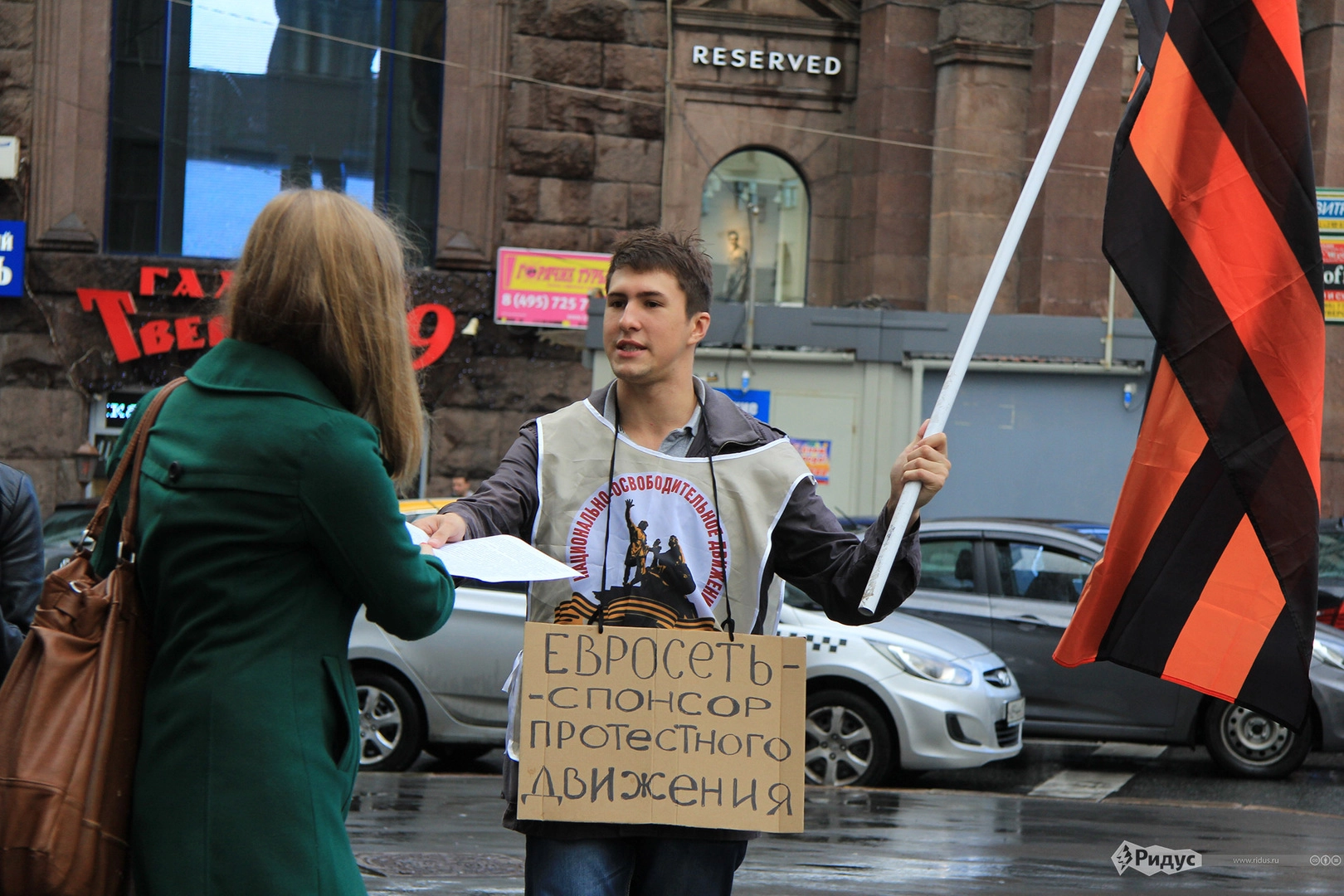 На Тверской улице собралось шесть человек. В их руках — сотни листовок и черно-оранжевый флаг. «Евросеть спонсирует предателей» аккуратно выведено черным маркером на картонке, висящей на шее Евгения Мазанько. Молодой человек работает энергетиком в строительной фирме и уже полгода состоит в Национально-освободительном движении России (НОД).