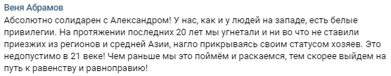 Давно уже пора понять: не надо делить людей на русских, узбеков, американцев, японцев — есть жители планеты Земля. Все должны быть наделены равными правами и возможностями. Ко всем надо относиться с уважением, — подытожил автор публикации.