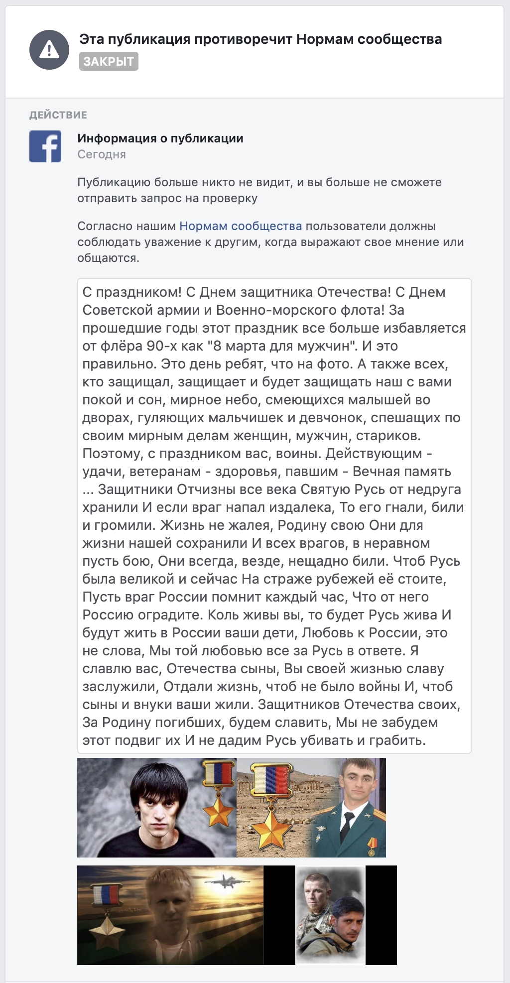 Facebook банит россиян за поздравления с Днем защитника Отечества