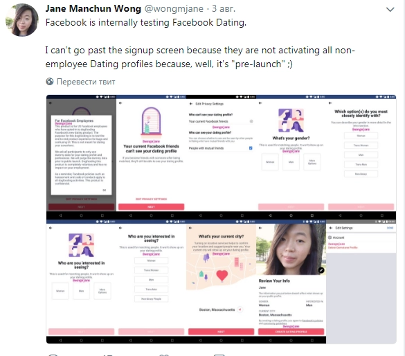 Сотрудники Facebook приступили к тестированию нового сервиса знакомств Dating. Его первые скриншоты опубликовала в Twitter специалист по обратной разработке Джейн Вонг.