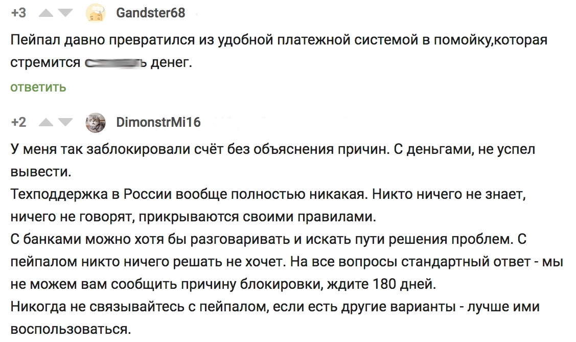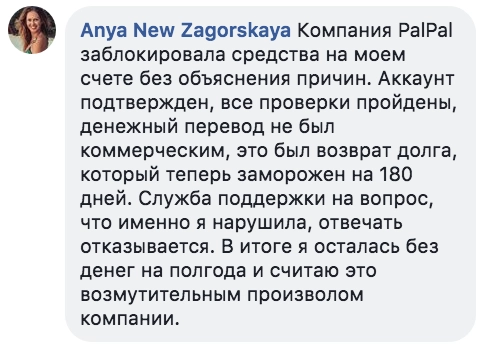 Со времени появления российского подразделения PayPal появилась стойкая брезгливость и отвращение к этой системе. Стараюсь теперь как можно реже использовать этот чудо-сервис, тем более толку от него практически никакого. Защита как покупателя, так и продавца минимальная, а геморроя гораздо больше. Вся политика PayPal направлена на удовлетворение собственной прибыли в первую очередь, иногда сомнительными способами (есть отдельная тема о безосновательной заморозке средств клиентов на 180 дней и больше), а на клиентов по большому счету им наплевать, — типичный отзыв о PayPal на сайте banki.ru.