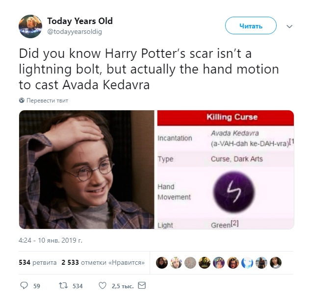 В Твиттере опубликовали пост о шраме Гарри Поттера, который способен пошатнуть знания фанатов о магической вселенной. Пользователь с ником Today Years Old утверждает, что шрам на лбу Гарри Поттера вовсе не знак молнии, а движение, которое совершается волшебной палочкой при убивающем заклинании «Авада Кедавра».