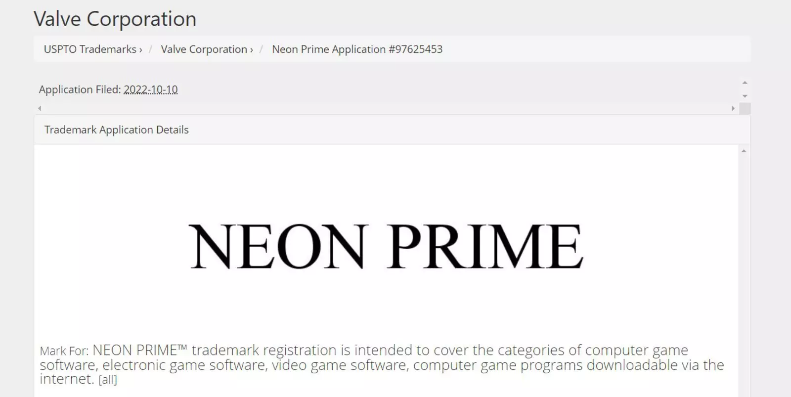 Как сообщил специалист Valve Гейб Фолловер, 14 октября Valve успешно зарегистрировала в Управлении по патентам и товарным знакам США новую торговую марку с интригующим названием Neon Prime. В описании указано, что этот товарный знак «предназначен для компьютерных игр и программного обеспечения для игр, загружаемых через интернет».