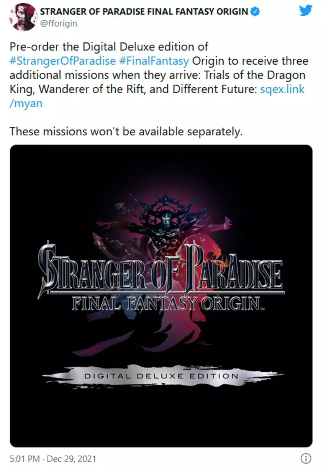 Компания Square Enix объявила, что в Stranger of Paradise: Final Fantasy Origins будут доступны дополнительные загружаемые миссии, которые можно получить, только оформив предварительный заказ игры в цифровом виде.