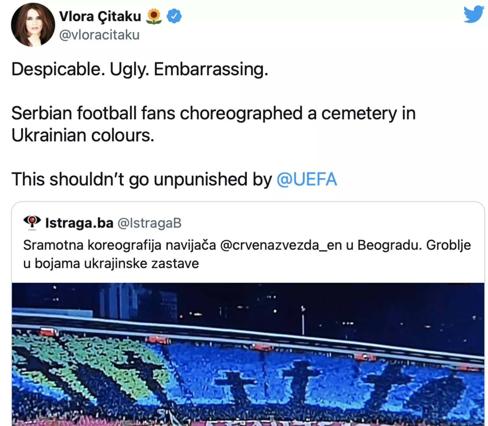 Фанаты сербского ФК «Црвена звезда» вывесили баннер с кладбищем цвета флага Украины