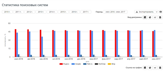 По данным сайта seo-auditor.com.ru, «Яндекс» на протяжении многих лет оставался самой популярной поисковой системой, но буквально в мае 2017 года уступил лидерство Google.