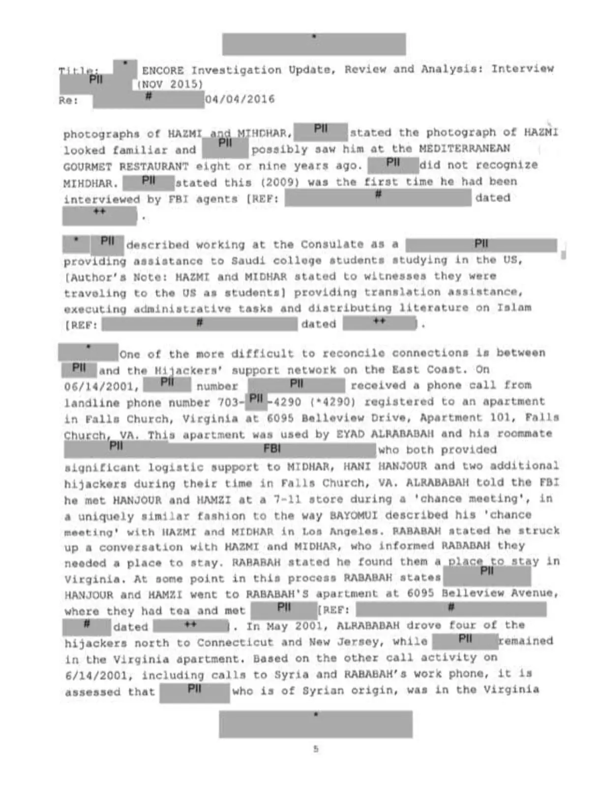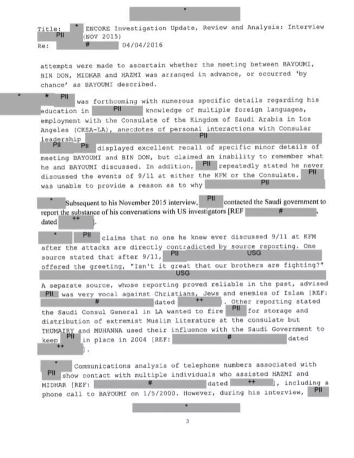 Это 16-страничное расследование ФБР в отношении сотрудника консульства Саудовской Аравии в Лос-Анджелесе и предполагаемого агента саудовской разведки, которые оказывали помощь захватчикам самолетов. Документ датирован 4 апреля 2016 года, часть текста вымарана.