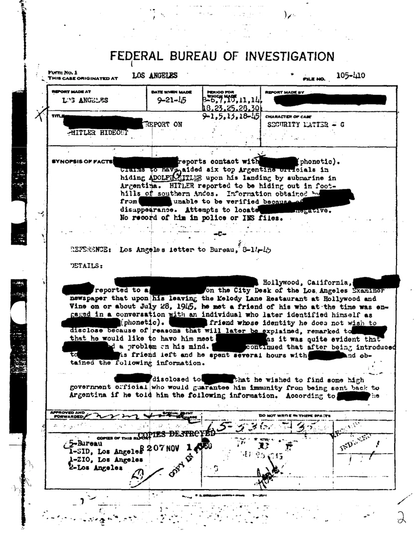 Федеральное бюро расследований США опубликовало отчет о расследовании версии побега фюрера Третьего рейха Адольфа Гитлера в Аргентину весной 1945 года. Из него следует, что американцы всерьез рассматривали возможность того, что фюрер пережил штурм Берлина советскими войсками.
