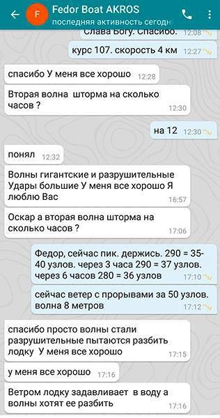 Лодка полностью утопает в ветровых, пенистых гребнях. В любой момент возможно опрокидывание лодки. По прогнозу этот шторм начнет стихать через 6−8 часов, но передышка будет короткой, уже с понедельника в район придет новый шторм, а в середине недели еще один.